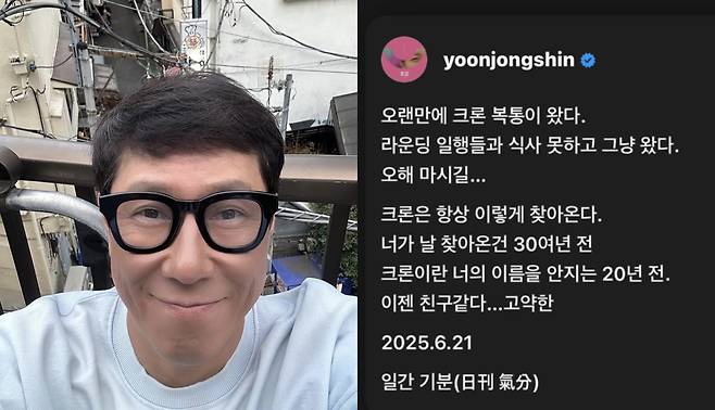 가수 윤종신이 오랜만에 크론병 복통을 호소하며 근황을 전했습니다.