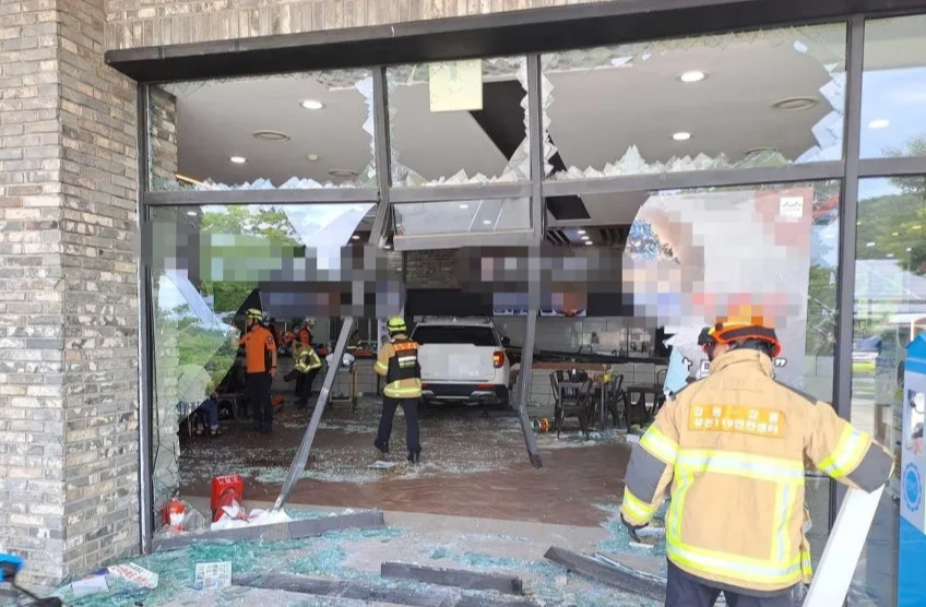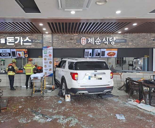 한 대의 흰색 SUV 차량이 식당 유리창을 뚫고 돌진해